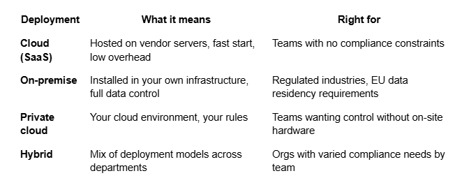 One thing often missing from AI workspace evaluations: most tools only offer cloud deployment. If data sovereignty matters to your organization, that's a hard constraint — and it eliminates most options before you even look at features. Platforms like BridgeApp support all four deployment models, including full on-premise — which is why they're gaining traction in finance, healthcare, and government teams that can't compromise on where their data lives.