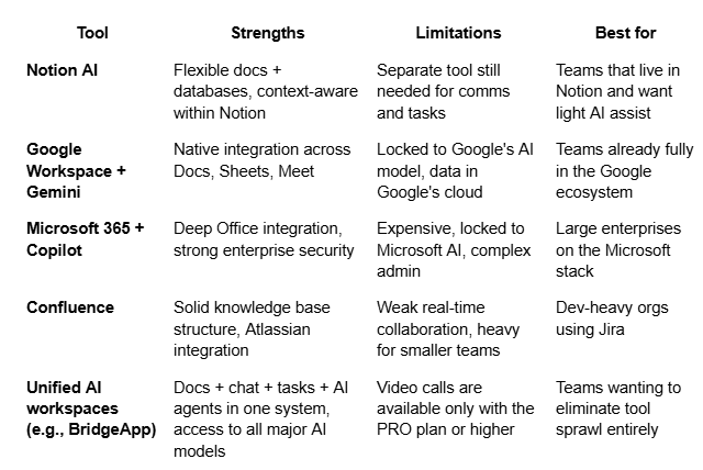 The market splits into two camps: specialized document tools with AI features added, and unified workspaces where documents are one component of a broader system.