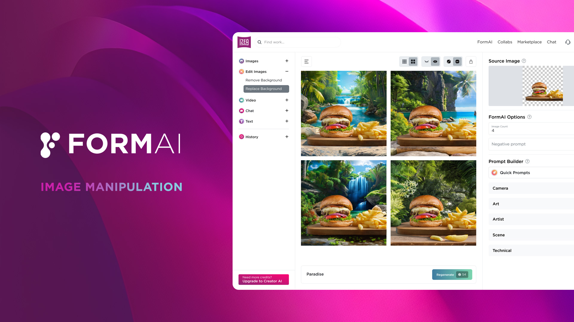 “Our suite of tools in FormAI equips marketers and creators with the resources they need to produce exceptional content with ease and efficiency,” said Ted Murphy, Founder and CEO of IZEA. “The addition of Image Manipulation to FormAI will help our community push the boundaries of their imagination and produce work that stands out in a crowded digital landscape."