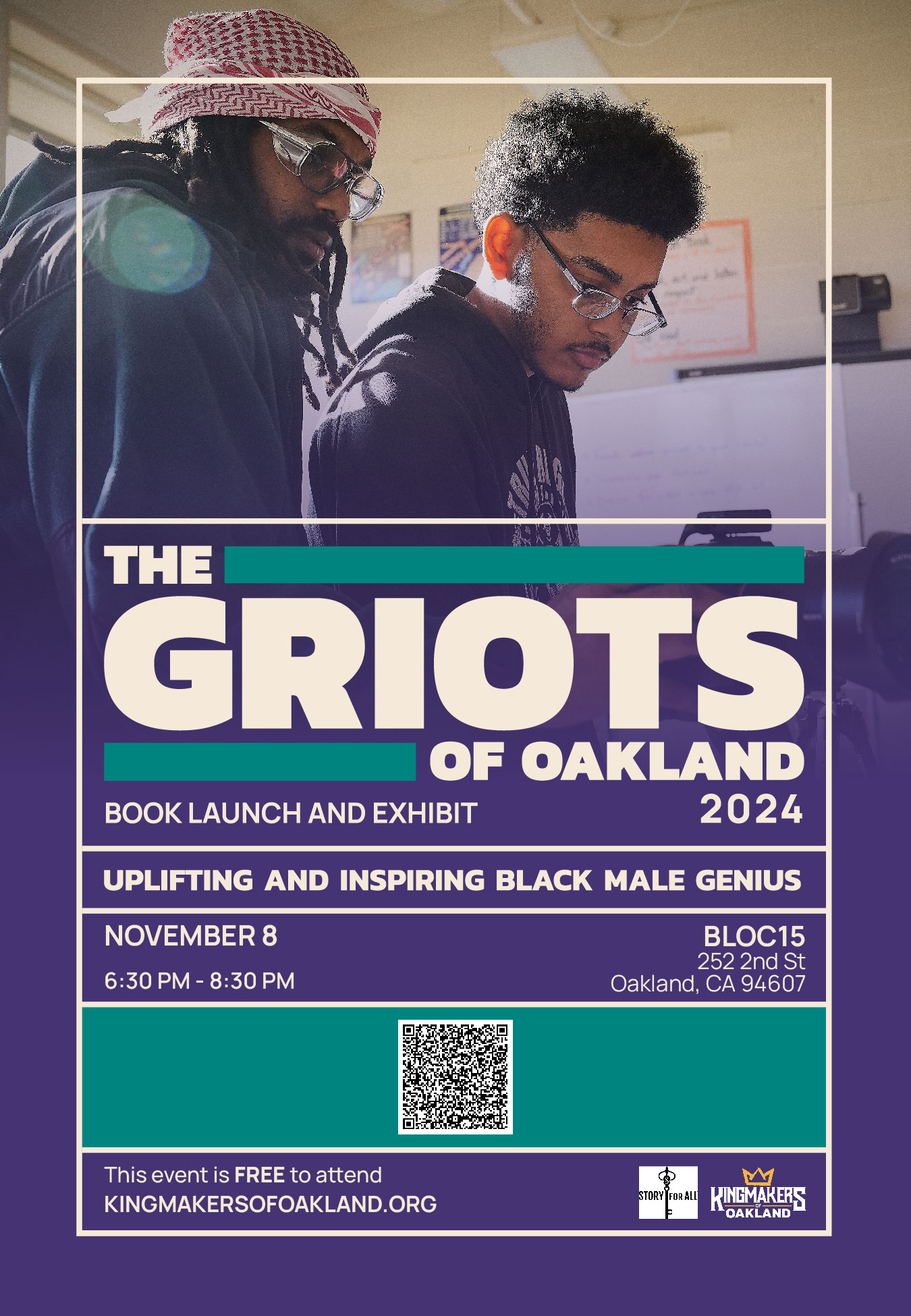 The "Griots of Oakland" book includes a powerful collection of oral histories that captures the diverse experiences of Black boys, offering insights into their personal identities, aspirations, and the unique challenges they face. Softcover ($50) and hardcover ($70) editions will be available for purchase at the event and exclusively on the Kingmakers of Oakland website through November (purchase here). It will be available at select retailers and Amazon in December.