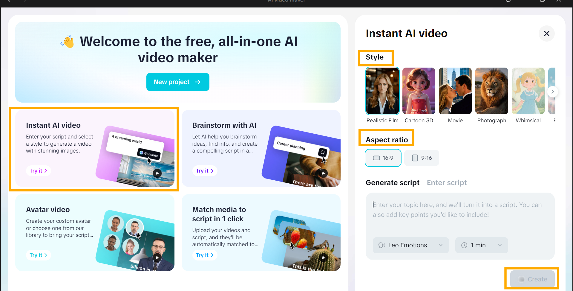 You have the option of using Instant AI Video to have the AI automatically arrange clips, or upload clips manually to be in total control. On the right-hand side, you may change video style, aspect ratio, and preview every scene before completing the storyboard.