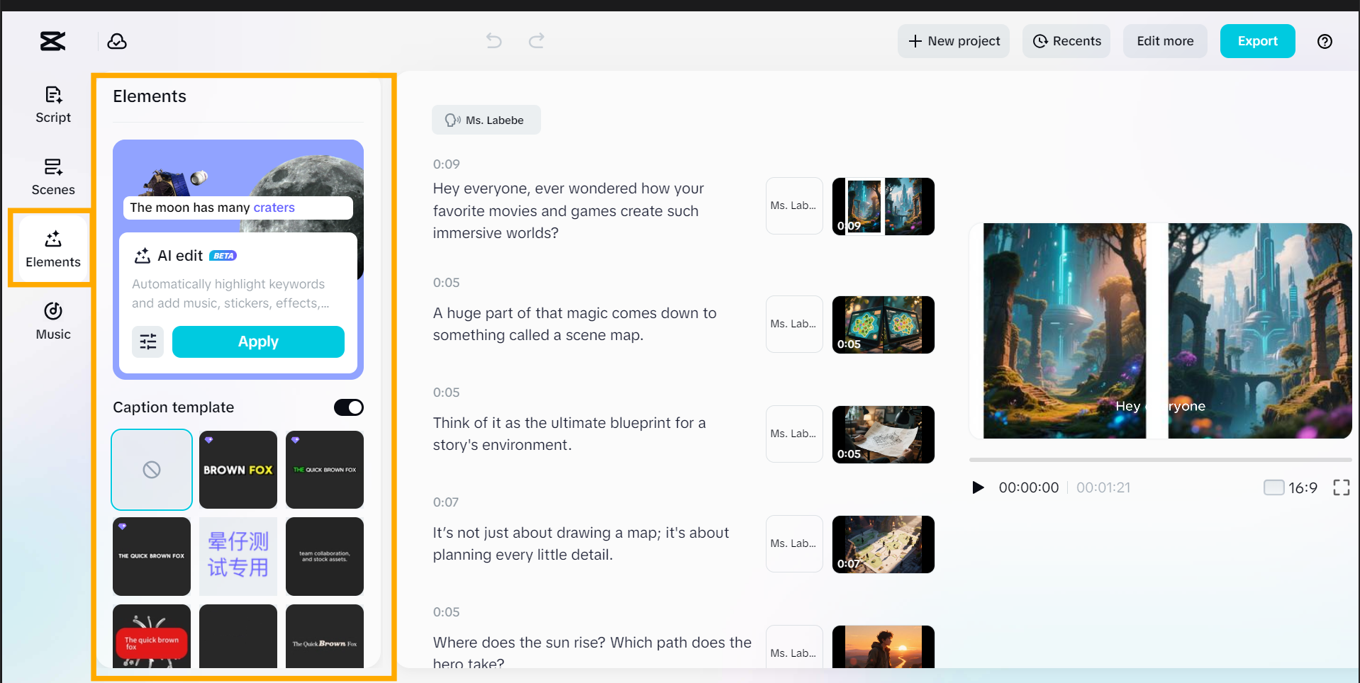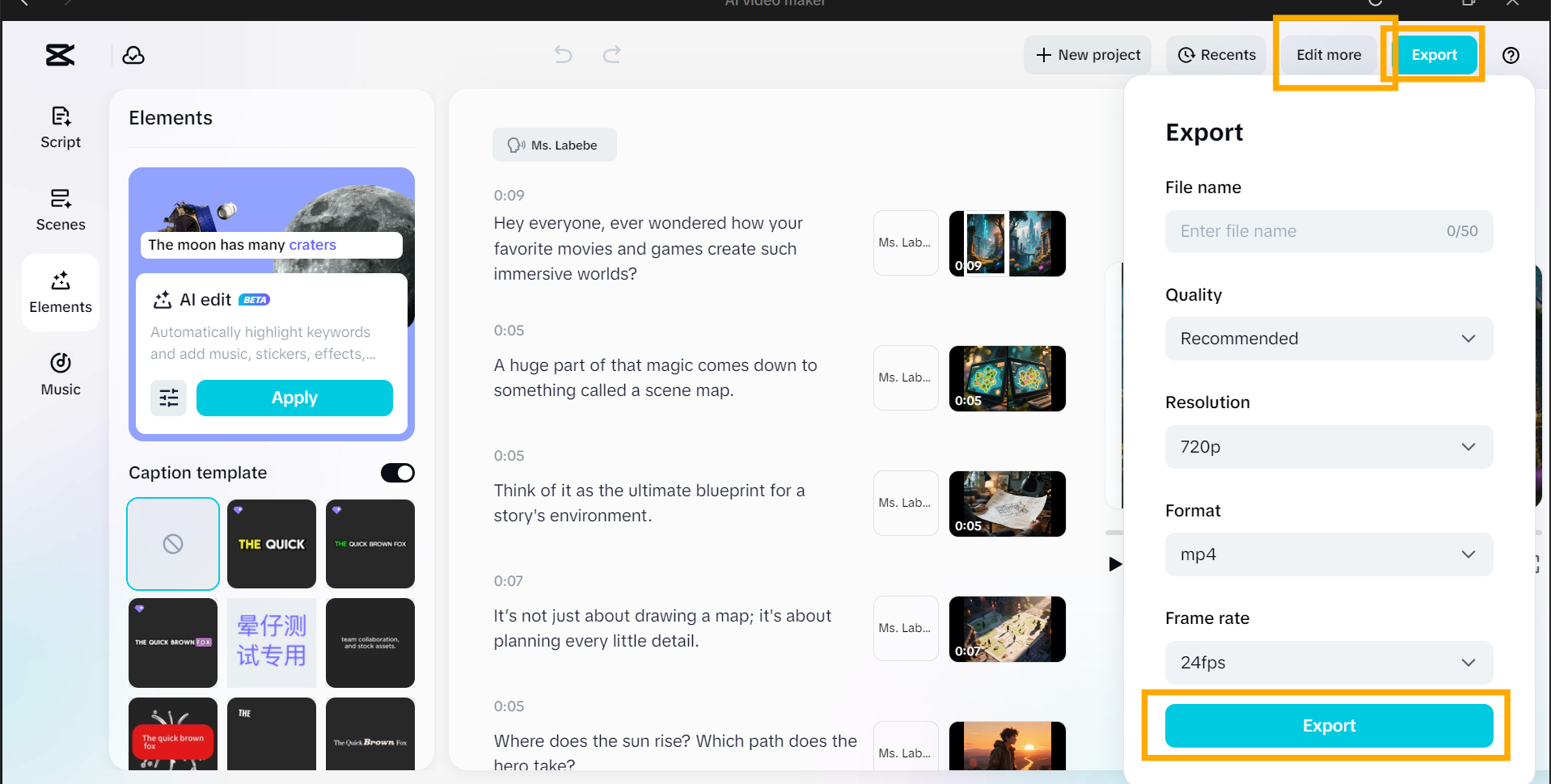 Insert text, stickers, or effects with the help of the left panel. Choose background music to fit every scene. AI Scene Highlight is able to highlight significant points so that the story can be told more effectively. You are now ready to save your project by clicking Export.